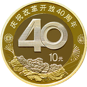 双色铜合金纪念币背面主景图案为阿拉伯数字“40”,背景图案为牡丹花、飘带和礼花。主景图案上方刊“庆祝改革开放40周年”字样,右下方刊面额“10元”字样。