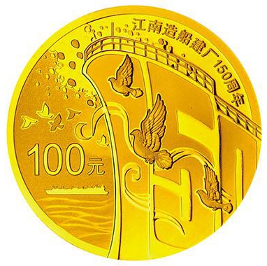 7.776克(1/4盎司)圆形金质纪念币背面图案为数字“150”构成的船体及鸽子、彩带、气球等造型组合设计,并刊“江南造船建厂150周年”字样及面额。