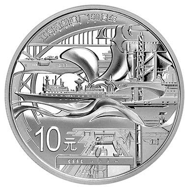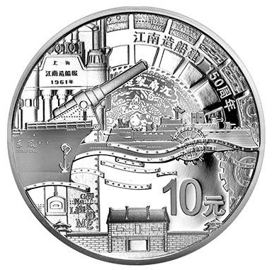 31.104克(1盎司)圆形银质纪念币背面图案为江南长兴造船基地船坞、龙门吊及所造舰船、卢浦大桥、螺旋桨等造型组合设计,并刊“江南造船建厂150周年”字样及面额。