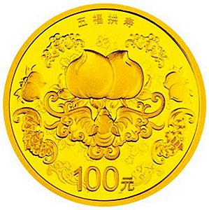 7.776克(1/4盎司)圆形金质纪念币背面图案为寿桃、蝙蝠造型,衬以吉祥花卉等图案组合设计,并刊“五福拱寿”字样及面额。