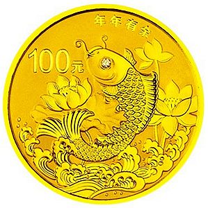 7.776克(1/4盎司)圆形金质纪念币背面图案为莲花、鲤鱼等造型组合设计,并刊“年年有余”字样及面额。