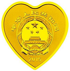 7.776克(1/4盎司)心形金质纪念币为精制币,含纯金7.776克(1/4盎司),外接正方形边长22毫米,面额100元,成色99.9%,最大发行量30000枚。