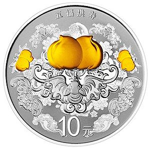 31.104克(1盎司)圆形银质纪念币背面图案为寿桃、蝙蝠造型,衬以吉祥花卉等图案组合设计,并刊“五福拱寿”字样及面额。