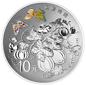 31.104克(1盎司)圆形银质纪念币背面图案为南瓜、藤蔓以及蝴蝶造型组合设计,并刊“瓜瓞绵绵”字样及面额。