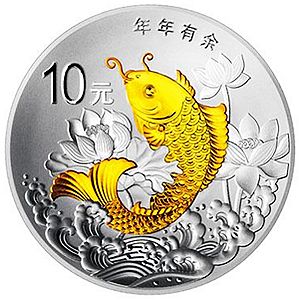 31.104克(1盎司)圆形银质纪念币背面图案为莲花、鲤鱼等造型组合设计,并刊“年年有余”字样及面额。