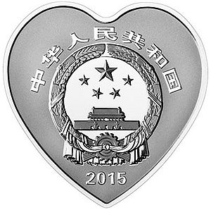 31.104克(1盎司)心形银质纪念币为精制币,含纯银31.104克(1盎司),外接正方形边长40毫米,面额10元,成色99.9%,最大发行量60000枚。
