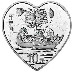 31.104克(1盎司)心形银质纪念币背面图案为鸳鸯、并蒂莲造型,衬以装饰荷叶纹样组合设计,并刊“并蒂同心”字样及面额。