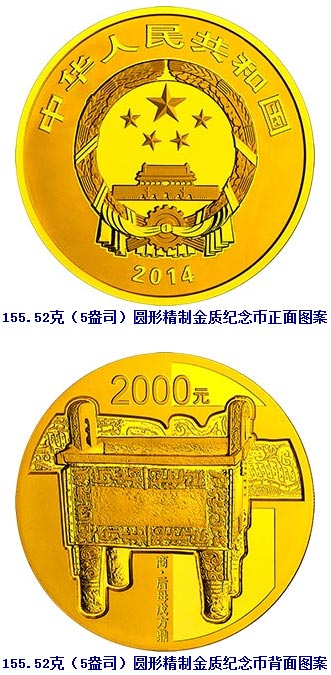 155.52克(5盎司)圆形金质纪念币背面图案为商代后母戊方鼎,衬以该器物典型纹样等装饰组合设计,并刊“商·后母戊方鼎”字样及面额。