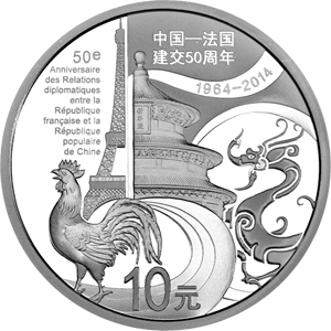 31.104克(1盎司)圆形银质纪念币背面图案为北京天坛祈年殿、中国龙造型和法国埃菲尔铁塔、高卢雄鸡造型对应设计,并刊“中国—法国建交50周年”中、法文等字样及面额。