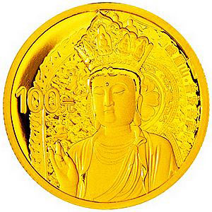 155.52克(5盎司)圆形金质纪念币背面图案为四面十方普贤菩萨造像,衬以火焰和祥云纹饰组合设计,并刊“峨眉山·四面十方普贤菩萨”字样及面额。