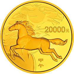以下12枚金银纪念币背面图案均为奔马造型衬以装饰马首纹样,并刊面额及“甲午”字样。