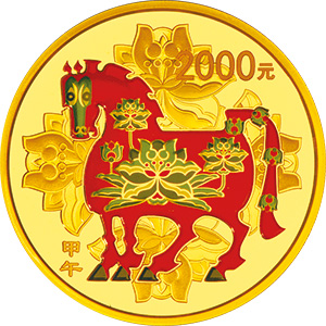 以下4枚金银纪念币背面图案均为中国民间传统装饰马造型衬以吉祥纹饰(局部彩色),并刊面额及“甲午”字样。