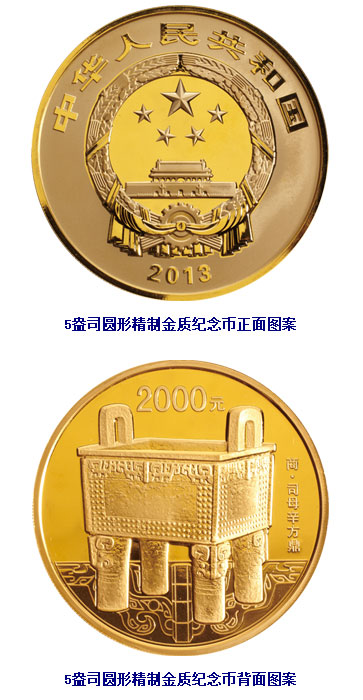 中国人民银行定于2013年5月23日发行中国青铜器金银纪念币(第2组)一套。该套纪念币共5枚,其中金币2枚,银币3枚,均为中华人民共和国法定货币。