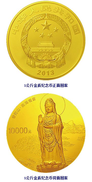 1公斤圆形金质纪念币背面图案为南海观音造像,衬以“海天佛国图”景观造型及海水纹饰组合设计,并刊“普陀山·南海观音”字样及面额。