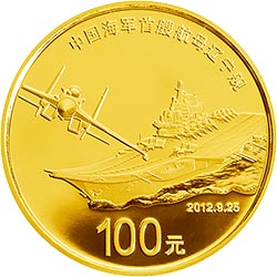 5盎司圆形金质纪念币背面图案为航母辽宁舰造型,配以舰载机造型、航母甲板、海军臂章等图案组合设计,并刊“中国海军首艘航母辽宁舰”、“2012.9.25”字样及面额。