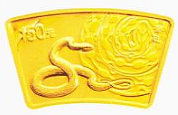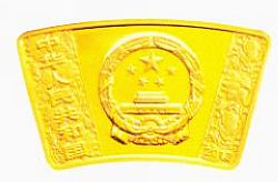 (五)1/3盎司扇形金质纪念币为精制币,含纯金1/3盎司,外圆半径51毫米,内圆半径36毫米,圆心角30度,面额150元,成色99.9%,最大发行量30000枚。
