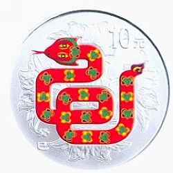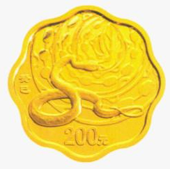 以下11枚金银纪念币背面图案均为写实蛇造型衬以装饰蛇纹样,并刊面额及“癸巳”字样。