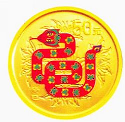 以下4枚金银纪念币背面图案均为中国民间传统装饰蛇造型衬以吉祥纹饰(局部彩色),并刊面额及“癸巳”字样。