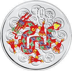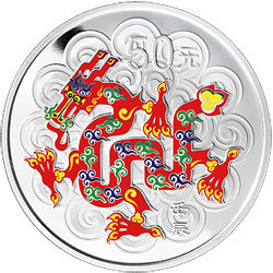以下4枚金银纪念币背面图案均为中国民间传统装饰龙造型衬以吉祥纹饰(局部彩色),并刊面额及“壬辰”字样。
