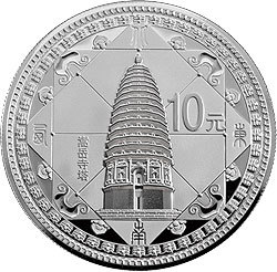1盎司圆形银质纪念币背面图案为嵩岳寺塔建筑造型,配以中国古代建筑斗拱、方位图及嵩岳寺塔建筑装饰图案等组合设计,并刊“嵩岳寺塔”中文字样及面额。