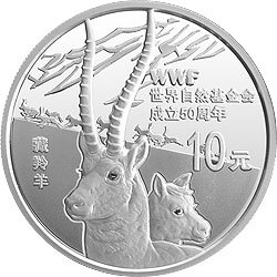 1盎司圆形银质纪念币背面图案为藏羚羊局部造型,衬以藏羚羊群和雪山为背景装饰组合设计,并刊“WWF”英文字样和“世界自然基金会成立50周年”中文字样及面额。