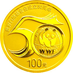 1/4盎司圆形金质纪念币背面图案为数字“50”装饰造型与世界自然基金会(WWF)标识和地球组合设计,并刊“世界自然基金会成立50周年”中文字样及面额。