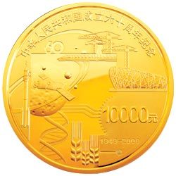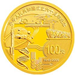 1公斤圆形金质纪念币、1/4盎司圆形金质纪念币、1公斤圆形银质纪念币背面图案相同,均为火箭、卫星、高速列车、奥运场馆、吊塔、齿轮、麦穗及DNA链、电子信息符号等装饰造型,并刊“中华人民共和国成立六十周年纪念”、“1949-2009”字样及面额。