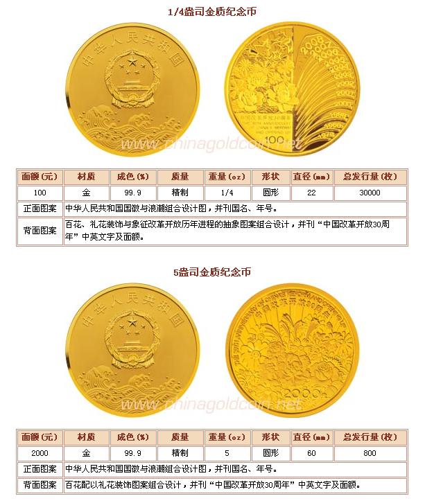 5盎司金质纪念币背面图案为百花配以礼花装饰图案组合设计,并刊“中国改革开放30周年”中英文字及面额。