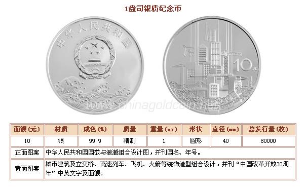 1盎司银质纪念币背面图案为城市建筑及立交桥、高速列车、飞机、火箭等装饰造型组合设计,并刊“中国改革开放30周年”中英文字及面额。