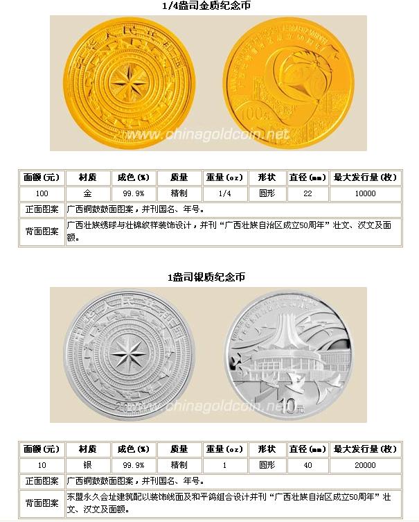 中国人民银行原定于2008年11月12日发行广西壮族自治区成立50周年金银纪念币一套。因纪念币背面壮文有误,该套纪念币推迟发行。现纪念币图案已修改,定于2008年12月6日发行。该套纪念币共2枚,其中金币1枚,银币1枚,均为中华人民共和国法定货币。