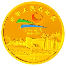 中国人民银行定于2008年4月8日发行海南经济特区成立20周年金银纪念币一套。该套纪念币共2枚,其中,1/4盎司金币1枚,1盎司银币1枚,均为中华人民共和国法定货币。