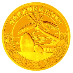 1/4盎司金质纪念币背面图案为南天一柱礁石、椰树配以环绕的海洋生物组合设计,并刊“海南经济特区成立20周年”中文字样及面额。