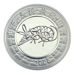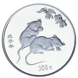 (十二)1公斤圆形银质纪念币为精制币,含纯银1公斤,直径100毫米,面额300元,成色99.9%,最大发行量3800枚。