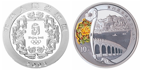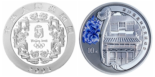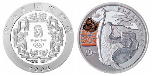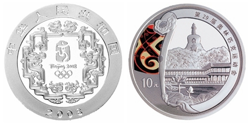 (2)1盎司银质纪念币(4枚)背面图案之一为中国长城、如意及中国传统彩陶纹饰造型,并刊“第29届奥林匹克运动会”中文字样及面额;之二为北京颐和园、如意及中国传统琉璃纹饰造型,并刊“第29届奥林匹克运动会”中文字样及面额;之三为北京北海公园、如意及中国传统漆艺纹饰造型,并刊“第29届奥林匹克运动会”中文字样及面额;之四为北京传统民居、如意及中国传统青花瓷纹饰造型,并刊“第29届奥林匹克运动会”中文字样及面额。