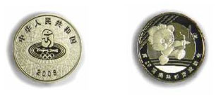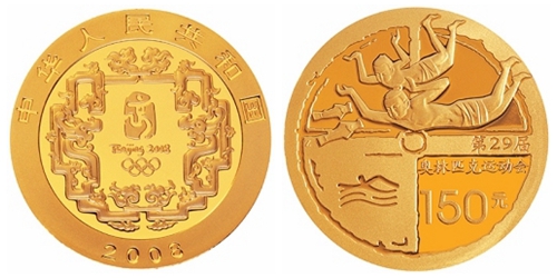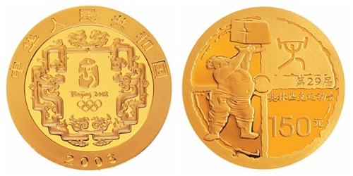 (1)1/3盎司金质纪念币(2枚)背面图案之一为中国古代游泳运动造型及第29届奥林匹克运动会体育项目——游泳图标,并刊“第29届奥林匹克运动会”中文字样及面额;之二为中国古代举重运动造型及第29届奥林匹克运动会体育项目——举重图标,并刊“第29届奥林匹克运动会”中文字样及面额。