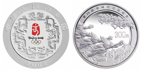 (4)1公斤银质纪念币背面图案为赛龙舟和赛马运动造型,并刊“第29届奥林匹克运动会”中文字样及面额。