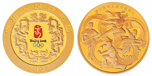 (3)5盎司金质纪念币背面图案为中国传统武术运动和奥运五环抽象造型,并刊“第29届奥林匹克运动会”中文字样及面额。