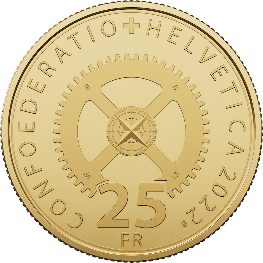 金币背面中央被设计成一个发条齿轮,周围环绕“瑞士联邦”拉丁文字样以及发行年份“2022”;面额“25FR”设置在币面最下方,与发条齿轮相咬合;齿轮中心被制作成一个指南针,齿轮发条的顶端雕铸着大写字母“W、E和S”以及数字“21”。