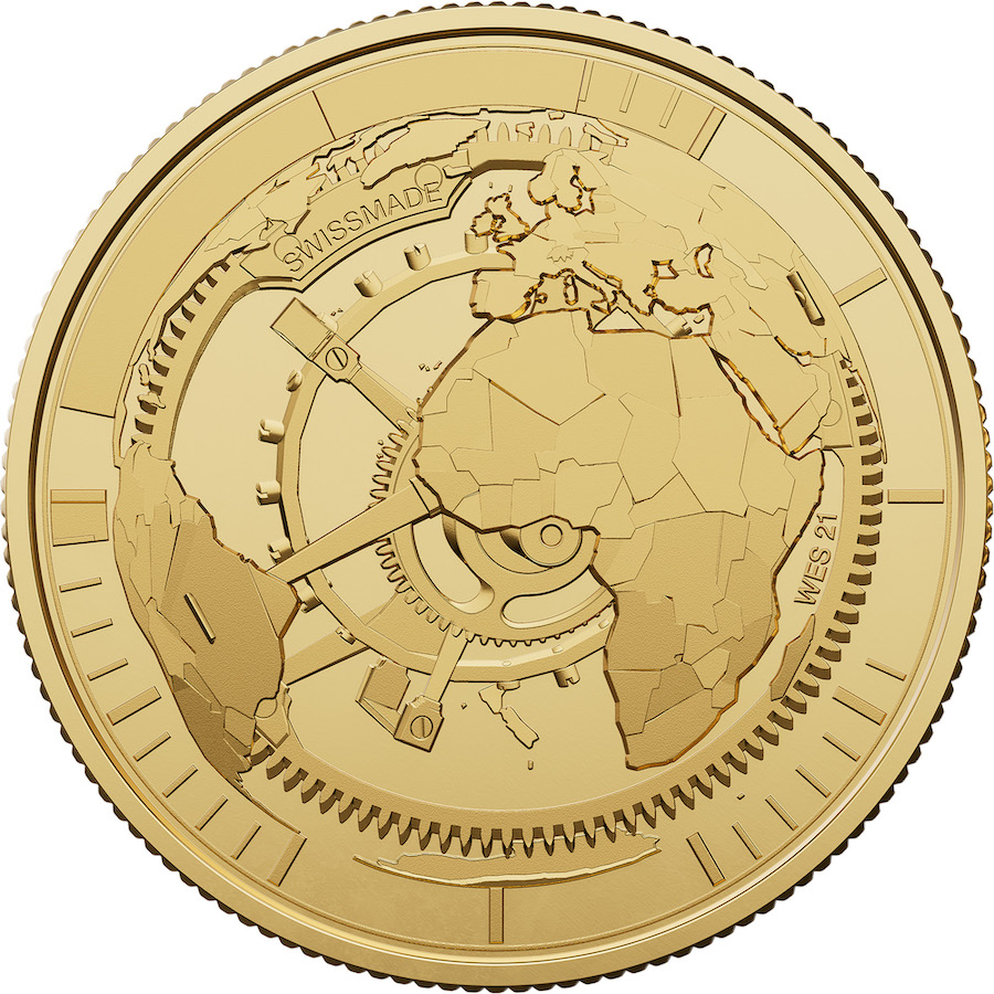 为纪念本国著名的行业钟表行业,2022年9月底,瑞士造币厂推出瑞士制表业“时光机器”金质纪念币。该枚硬币是瑞士首枚面额为25瑞士法郎的金币。时光机器金币的正面设置了一个钟表表盘和一个以地球仪为中心的手表机芯齿轮。币面地球仪上的瑞士版图轮廓浮雕较为突出,寓意瑞士制表业在世界工业中的重要地位,其产品亦畅销于世界各国。左上角则雕刻了“SWISSMADE”典型标志。